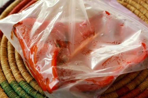 After 20 mins, remove the bell peppar and place in plastic bag.